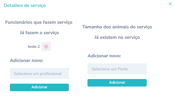Para remover basta clicar no botão cinza com um ‘’X’’ vermelho no meio, e para adicionar basta selecionar os funcionários/colaboradores ou um porte/tamanho na barra de seleção: “Selecione um profissional” e/ou “Selecione um porte” respectivamente, e depois clicar no botão azul com branco,” Adicionar “.