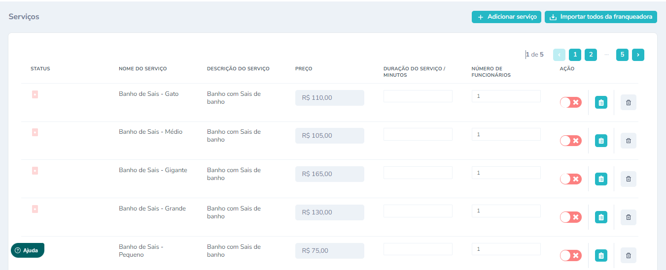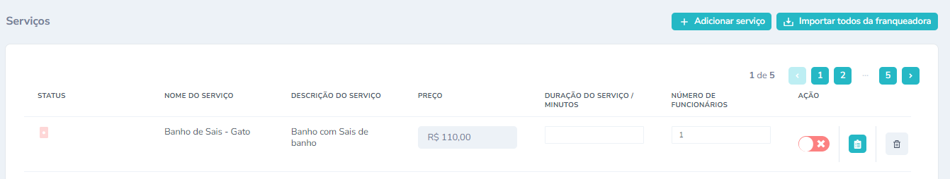 - “Nome do serviço”, nesta coluna irá aparecer o nome completo do serviço criado pela franqueadora DOCG. ou da forma que criou no seu sistema.